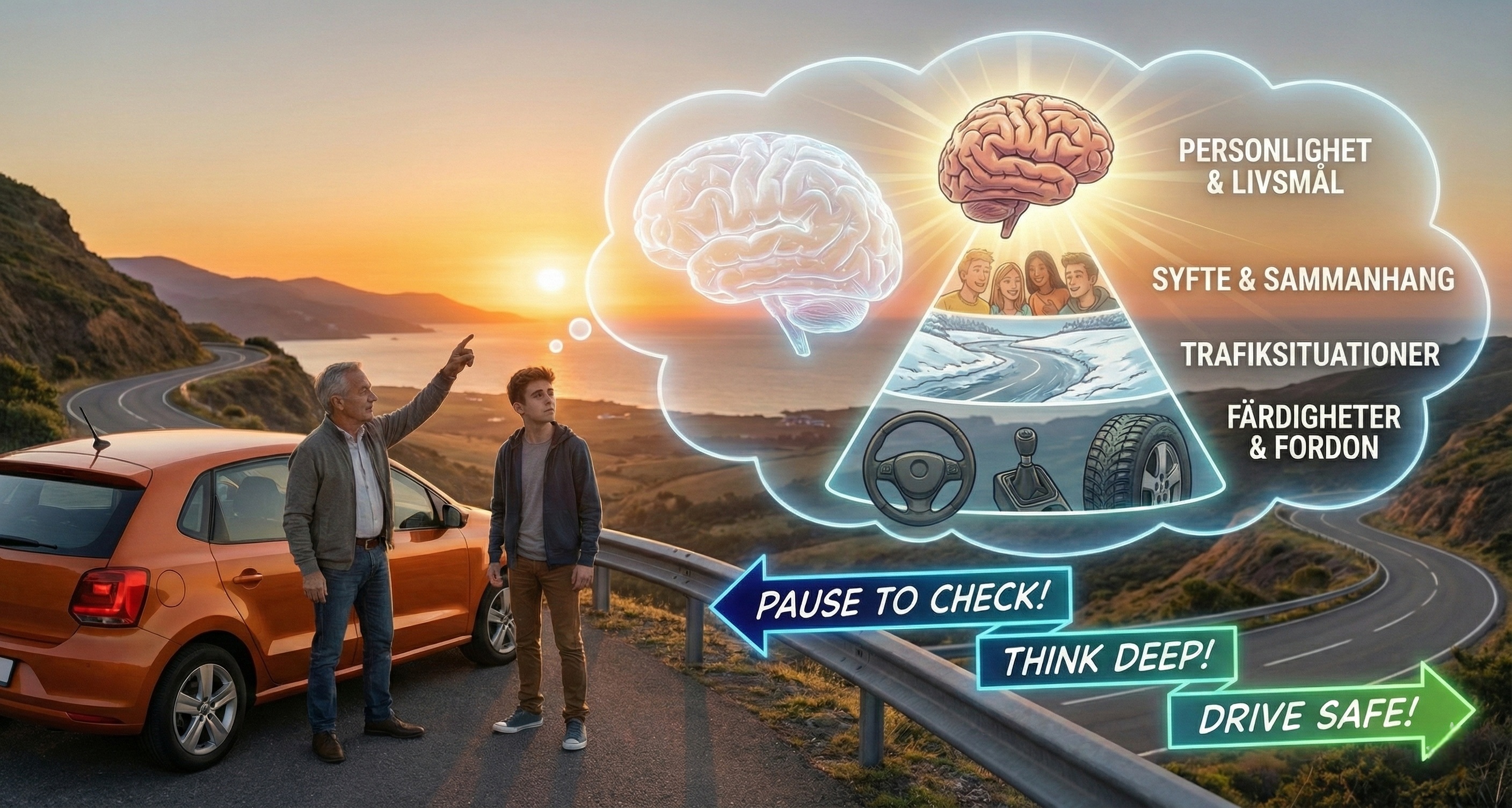 Enligt den internationella GDE-matrisen och den svenska kursplanen avgörs trafiksäkerheten i en hierarki av fyra nivåer: